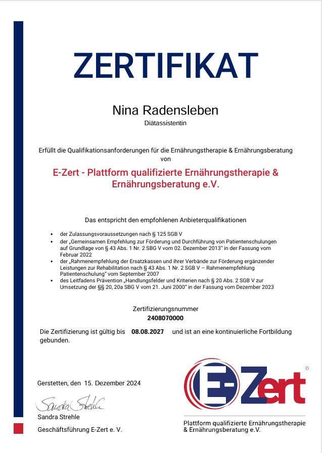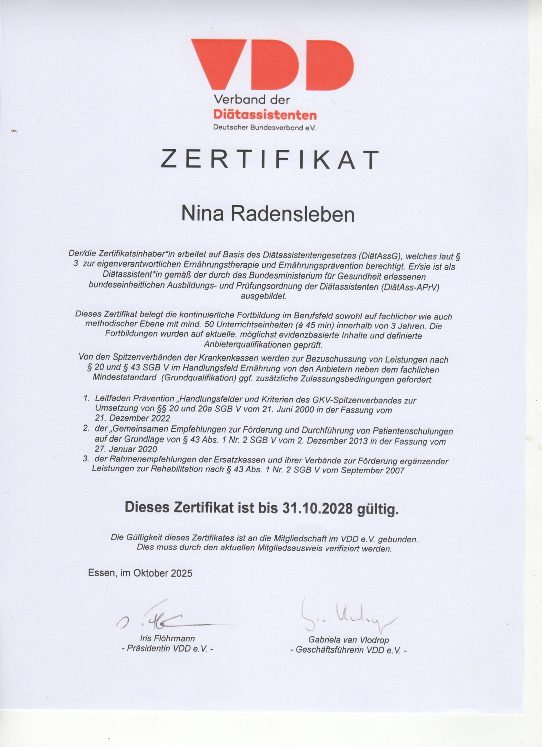 - zertifiziert durch den VDD – Verband der Diätassistenten – Deutscher Bundesverband e.V. seit 2011